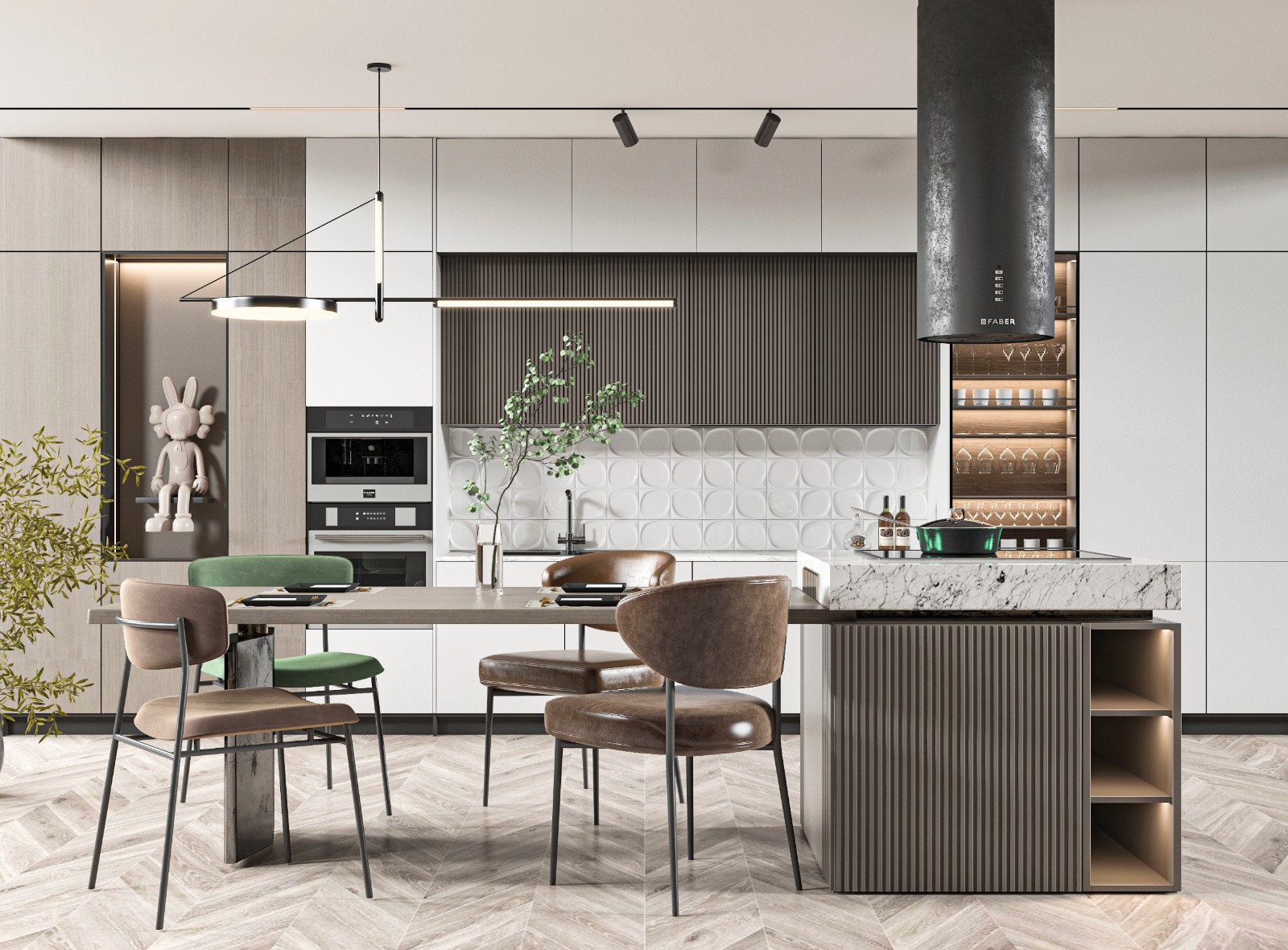 This kitchen is a masterclass in blending cozy wood tones, sleek surfaces, and artistic flair. The herringbone wood flooring lays a timeless foundation, while the mix of neutral cabinets and a bold, industrial-style range hood creates visual intrigue. A whimsical art sculpture and an architectural pendant light inject contemporary artistry, making the space feel both inviting and cutting-edge—perfect for those who want their kitchen to tell a story.