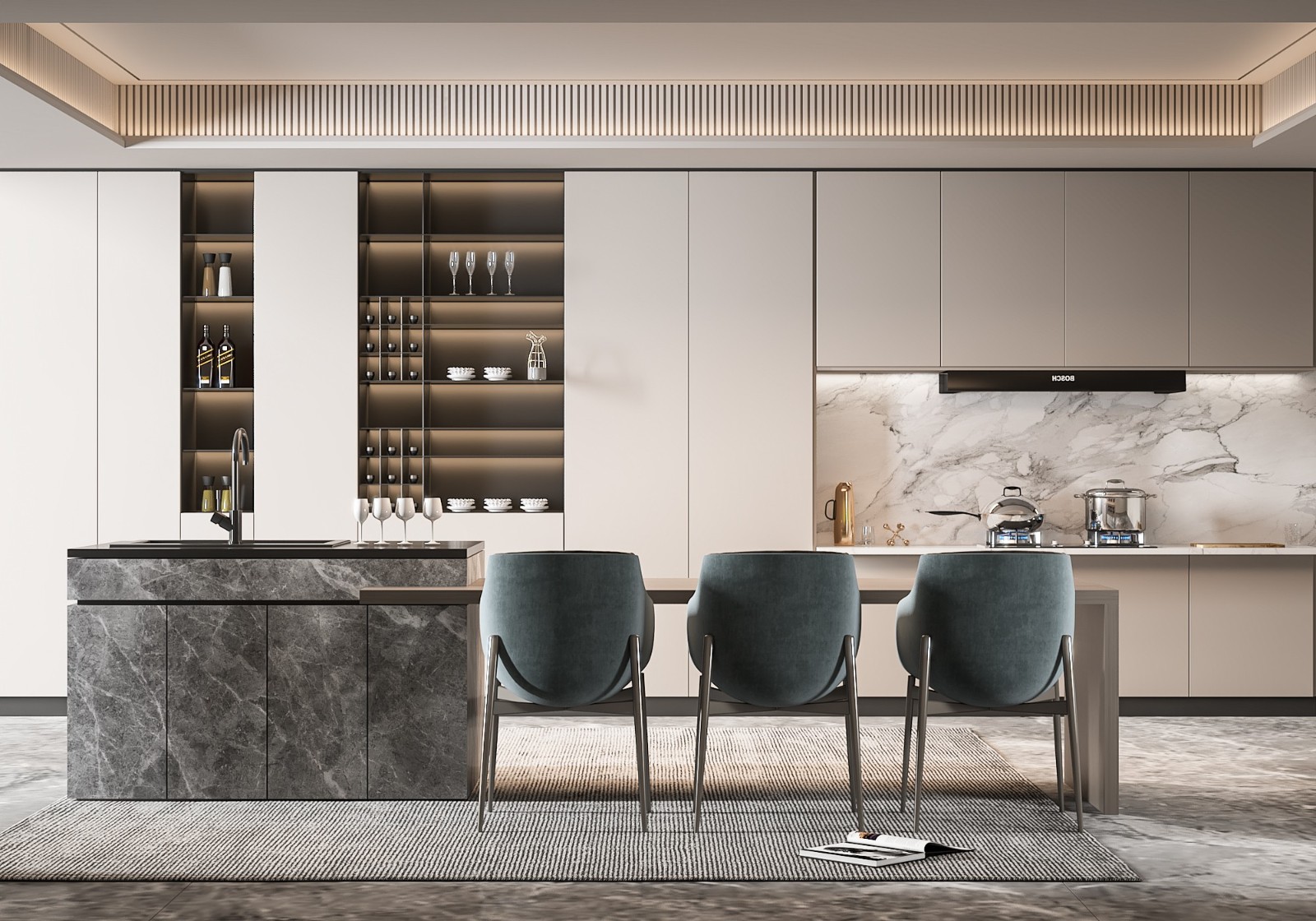 Here, classic design elements (think paneled cabinets and elegant marble) dance with modern touches like a geometric pendant light and metallic accents. The open wine storage and intricately detailed dining chairs bridge the gap between “cooking space” and “entertainment hub,” showing how traditional charm can coexist with contemporary energy.
